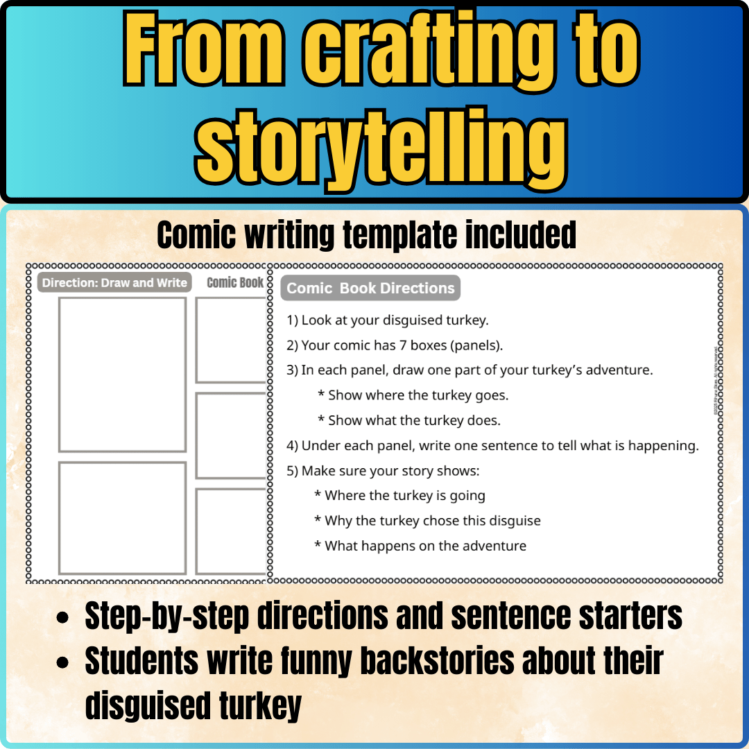 - From Crafting to Storytelling: The project doesn't end with the glue. We include a Comic Writing Page where the child has to explain their disguise. They use sentence starters to tell the story of why the turkey is hiding and where it is going.